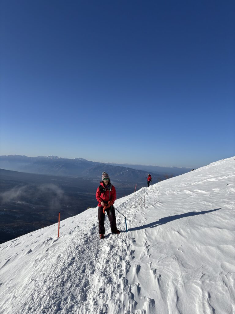 Our journey began in the quiet of the early morning. With headlamps cutting through the darkness, Sachi and I hit the trail at 5:30 a.m. There is a certain stillness in the mountain air at that hour that makes every step feel significant. The trail was well-maintained, marked by the reassuring “stamp” of previous hikers’ footprints frozen into the snow. The squeaking of snow sounds feels good on our feet, a constant, satisfying rhythm of a winter trek.